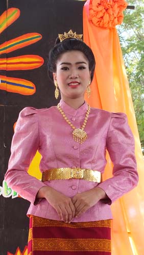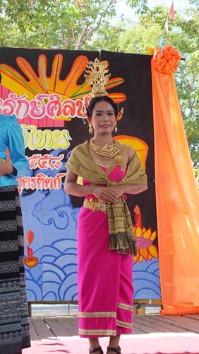 นางนพมาศแต่งกายโดยผ้าทอพื้นบ้านน้ำอ่าง กังหันลม การแต่งคำประพันธ์