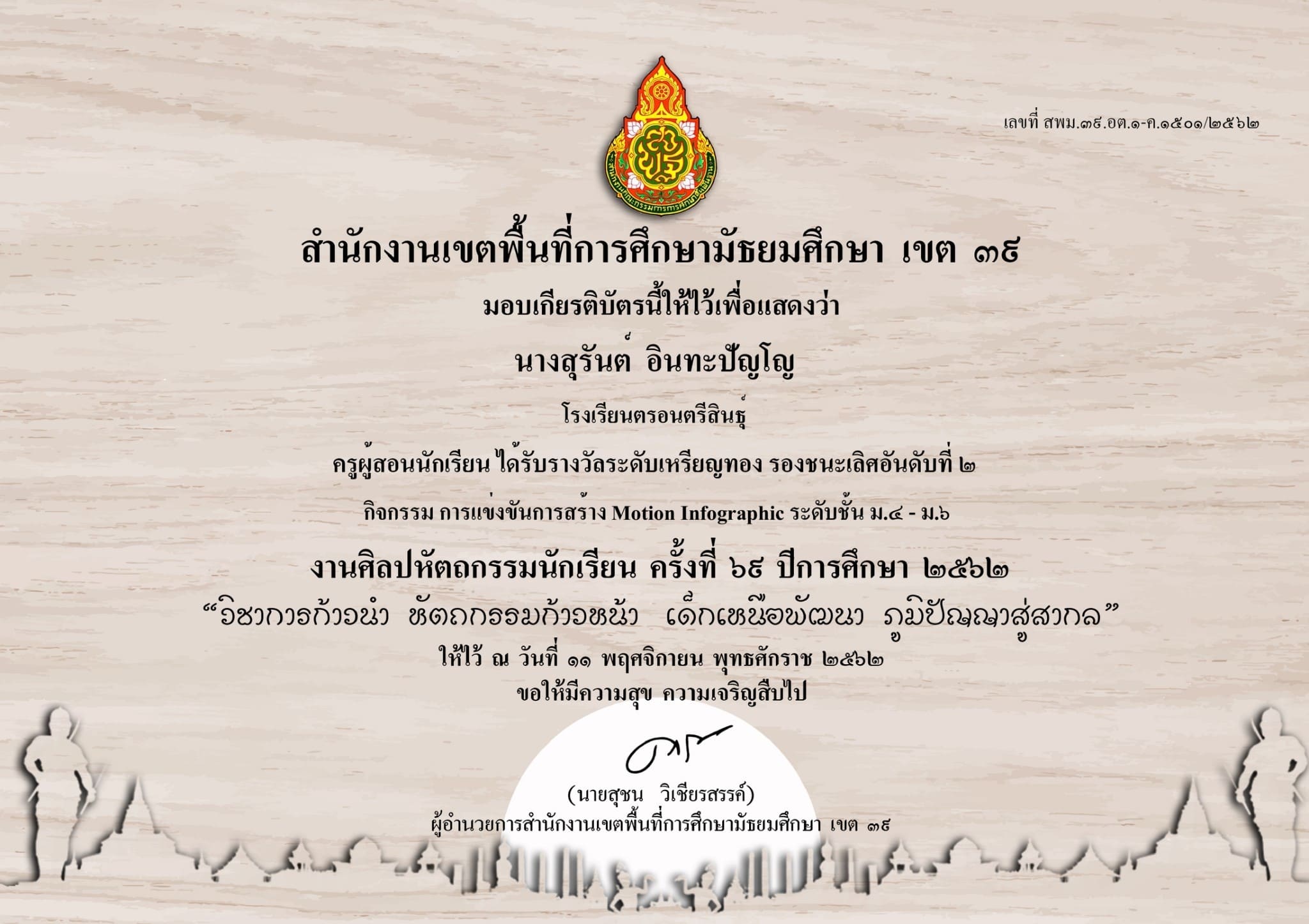 ครูผู้สอนนักเรียน ได้รับรางวัลระดับเหรียญทอง รองชนะเลิศอันดับที่ 2 กิจกรรม การแข่งขันการออกแบบสิ่งของเครื่องใช้ด้วยโปรแกรมคอมพิวเตอร์ ระดับชั้นม.1-ม.3 งานศิลปหัตถกรรมนักเรียน ครั้งที่ 69 ปีการศึกษา 2562 |