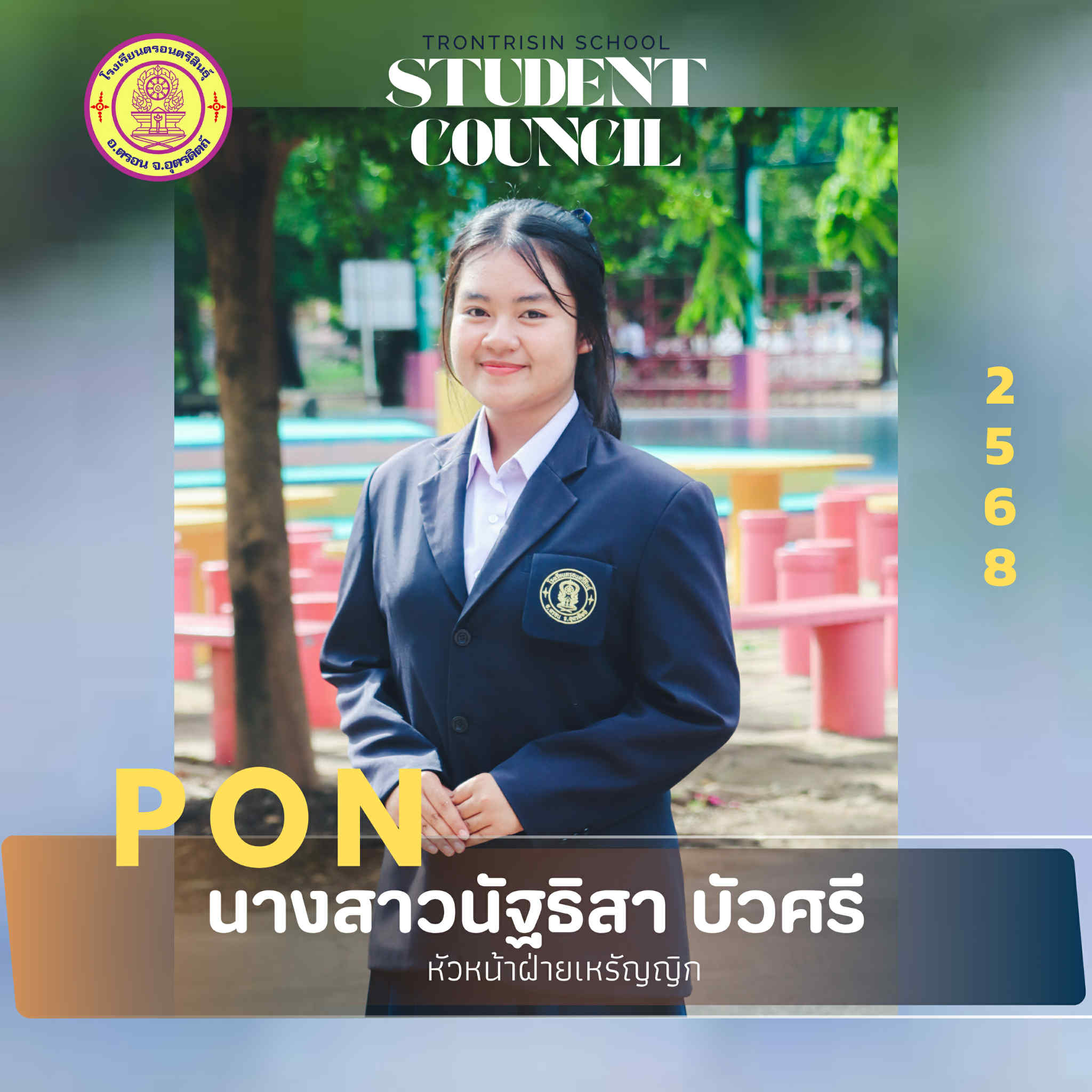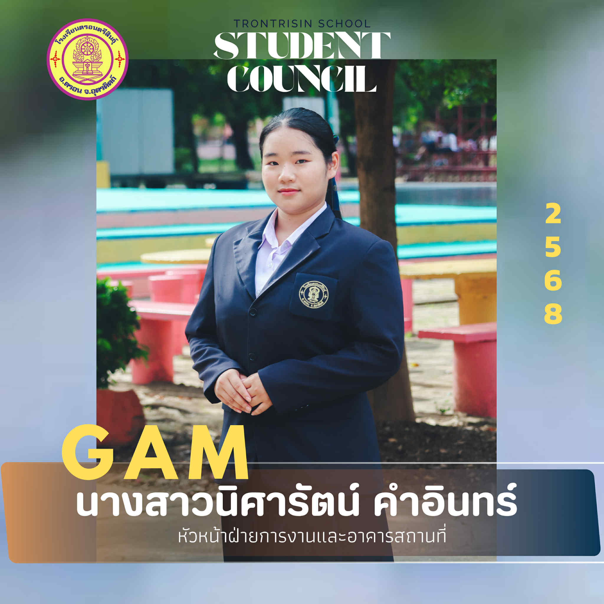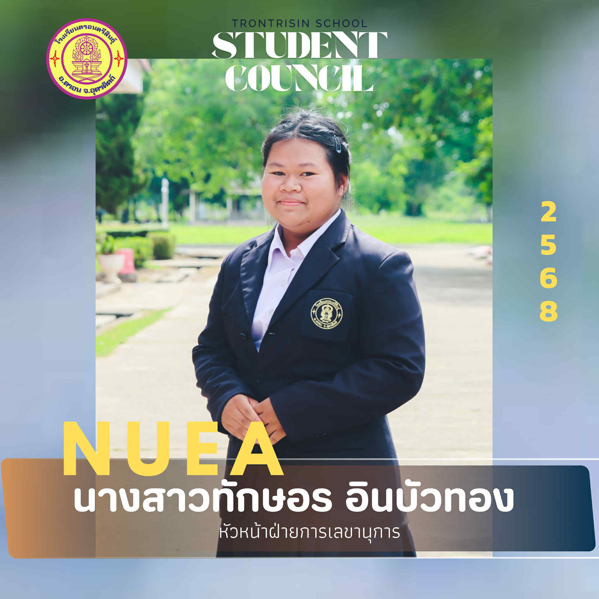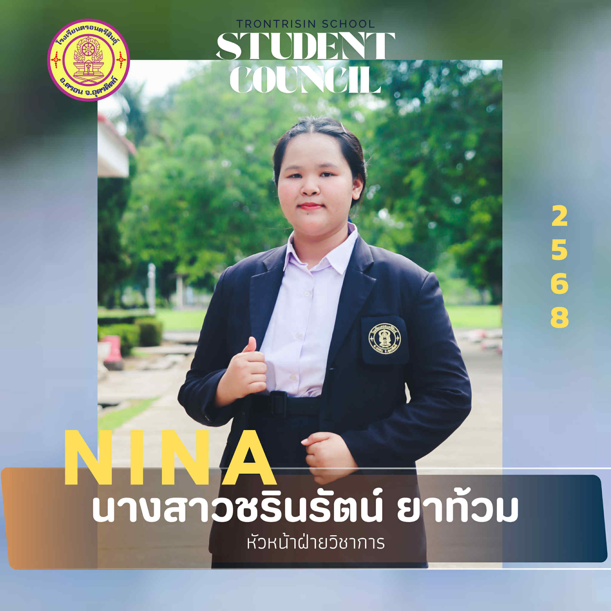 ชื่อ-นามสกุล : นางสาวนิศารัตน์ คำอินทร์ ตำแหน่ง : หัวหน้าฝ่ายอาคาร สถานที่ ระดับชั้น : มัธยมศึกษาปีที่ 5